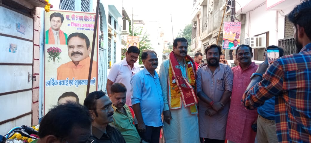 ग्वालियर । भारतीय जनता पार्टी प्रदेश कार्यसमिति सदस्य अभय चौधरी के चौथी बार भाजपा जिलाध्यक्ष बनने के बाद पहली बार नगर आगमन पर भाजप